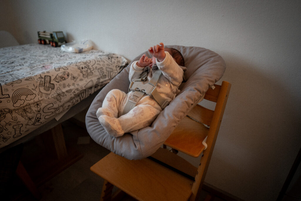Hier seht ihr das Newborn Set im Einsatz. Für uns ist es ein echter Gewinn, da unser Baby von Anfang an dabei sein kann – und das in bequemer Höhe beim Füttern oder einfach mitten im Familiengeschehen.