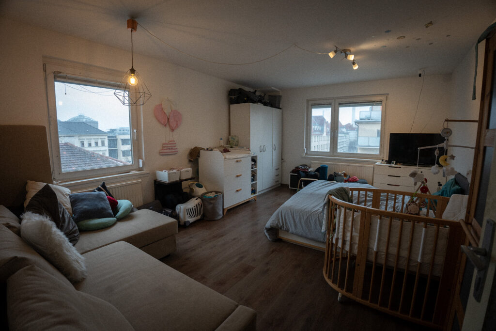 In unserem Schlafzimmer befinden sich sowohl das Babybett als auch der Wickeltisch.