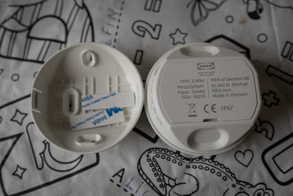 Im Vorzimmer haben wir zwei MYGGSPRAY Bewegungsmelder installiert, die jeweils KAJPLATS Glühbirnen ansteuern (E27 mit 1521 lm bzw. E14 mit 470 lm).