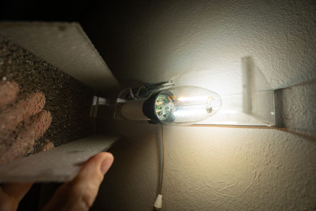 In der Toilette haben wir ebenfalls einen Bewegungsmelder sowie eine KAJPLATS Glühbirne installiert (E27, 470 lm – vollkommen ausreichend). Auch hier ist das Licht an den Tag-Nacht-Rhythmus angepasst.