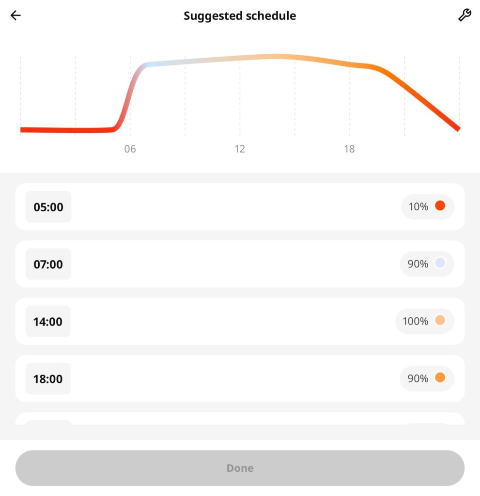 Über die App haben wir festgelegt, dass das Licht nachts stark gedimmt und wärmer leuchtet, während es tagsüber heller und mit kühlerem Weißlicht eingeschaltet wird.