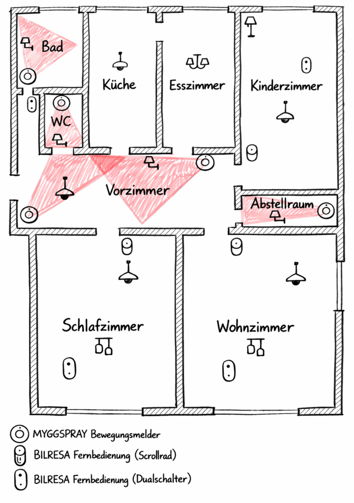 Im Bad ist das Setup ähnlich. Zusätzlich haben wir hier eine BILRESA Fernbedienung mit Dualschalter angebracht, mit der sich das Licht bei Bedarf auch tagsüber manuell einschalten lässt. Der Cooldown des Bewegungsmelders ist bewusst länger eingestellt, sodass man sich nicht ständig bewegen muss, um das Licht aktiv zu halten.