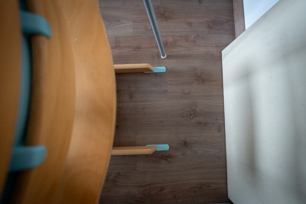 In contrast, the Tripp Trapp high chair requires less space and can even be pushed under the table (without the Baby Set). However, there have been accidents where children have caused the chair to tip over by pushing themselves away from the table. For this reason, the Baby Set includes extended gliders, which effectively prevent this from happening: